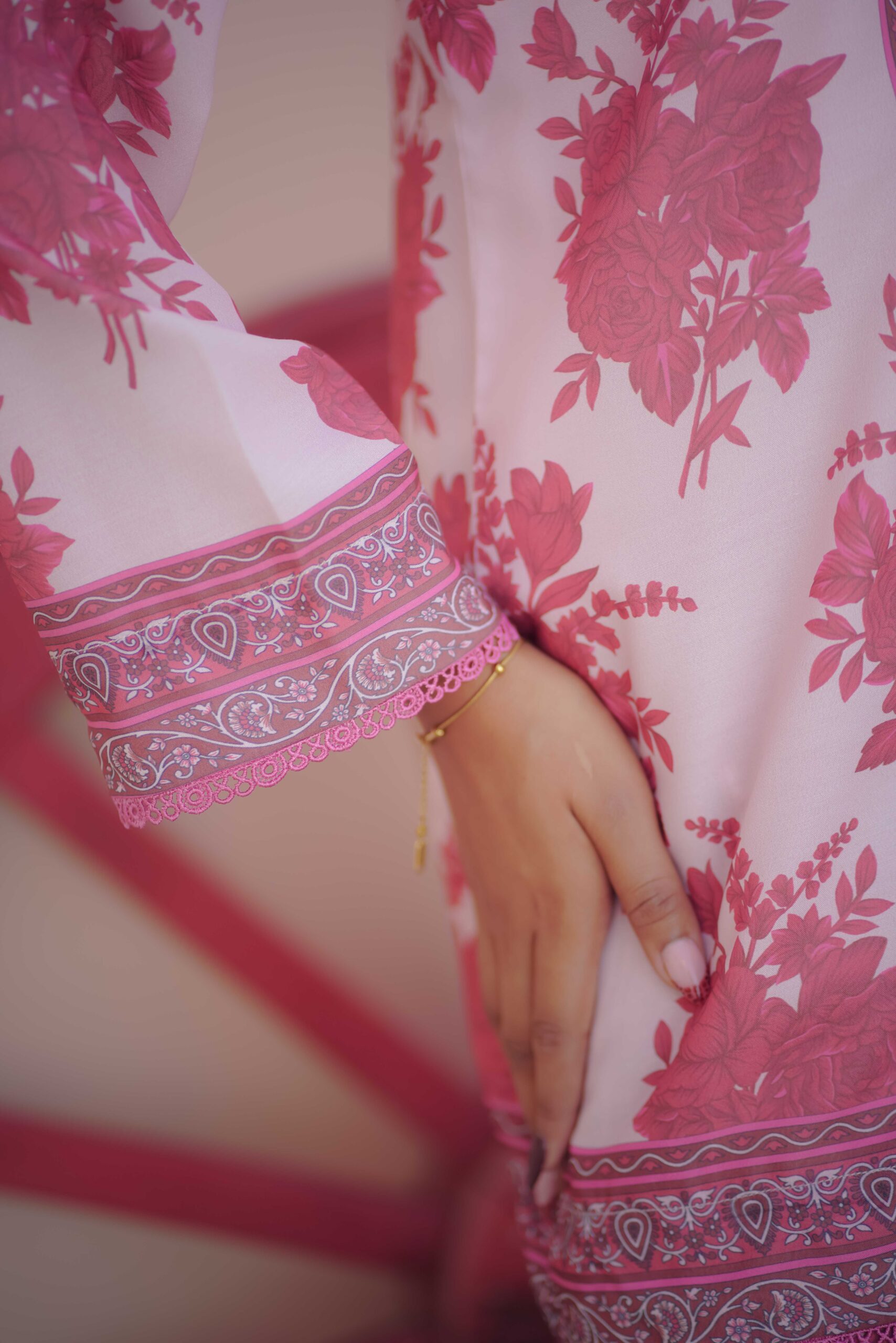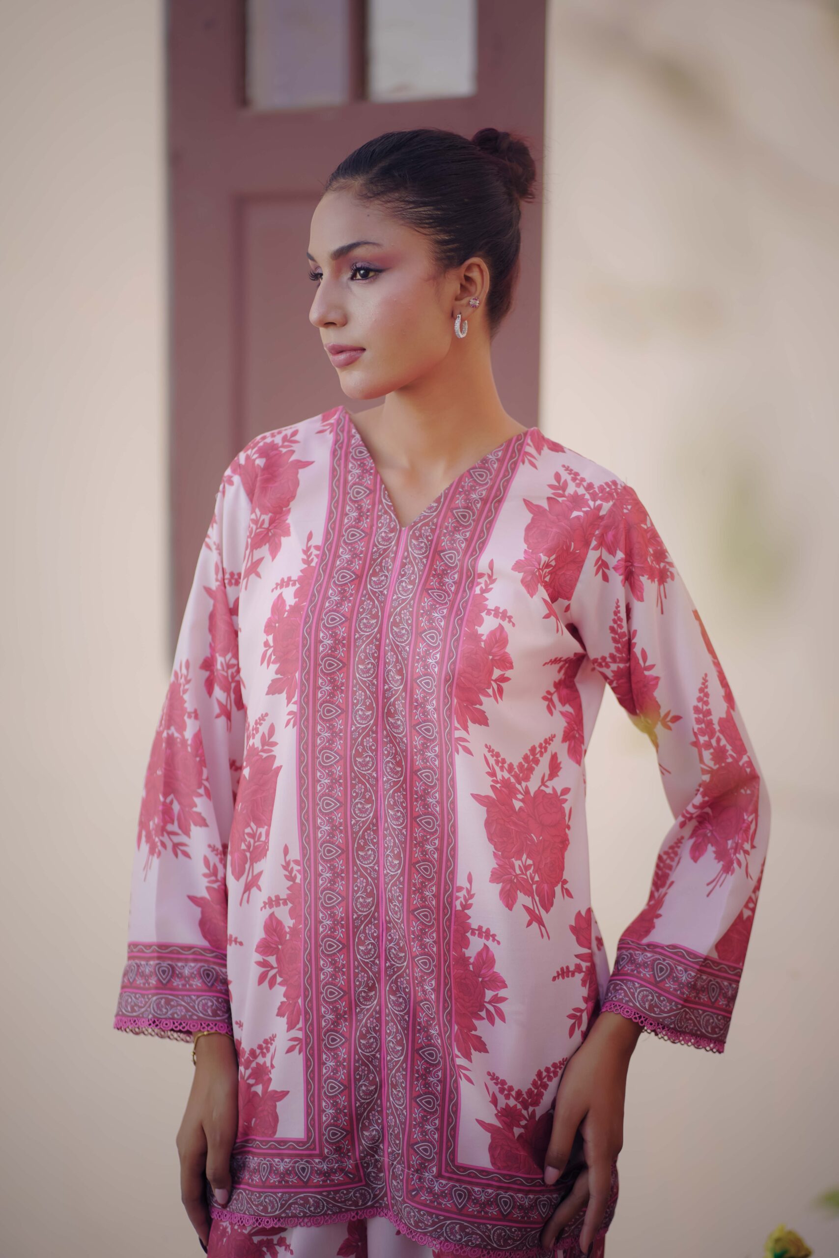 A soft and feminine off-white Swiss lawn co-ord with delicate pink patterns — perfect for a graceful summer look.